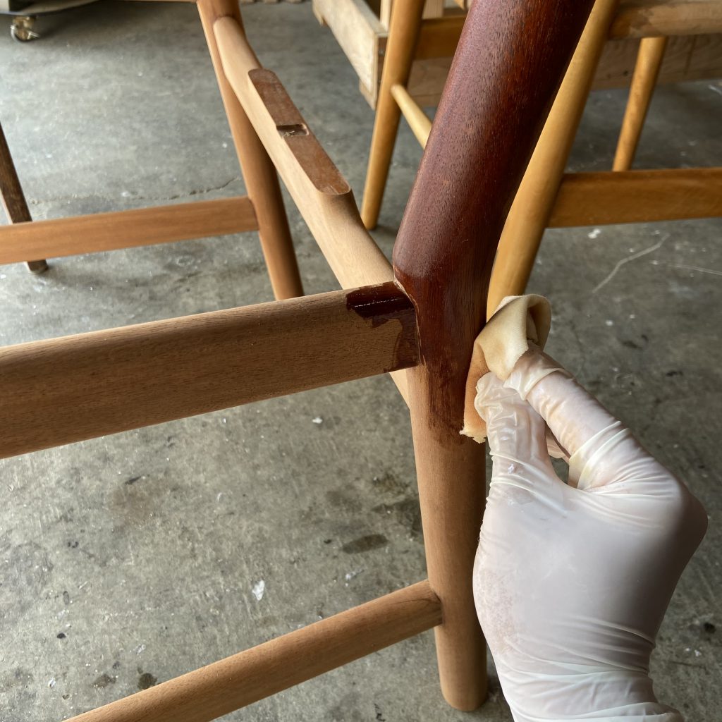 サンディング後にエアーで吹き、水拭きをして乾燥させ、材質に適したオイルを塗布します