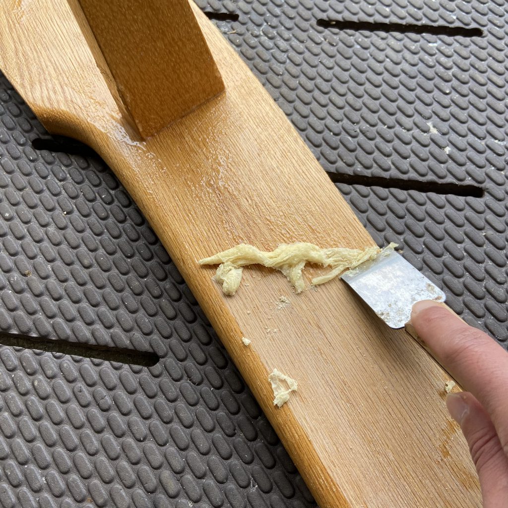 ブラシで優しく磨き、残りの塗膜と木目に入り込んでいる汚れを取り除きます