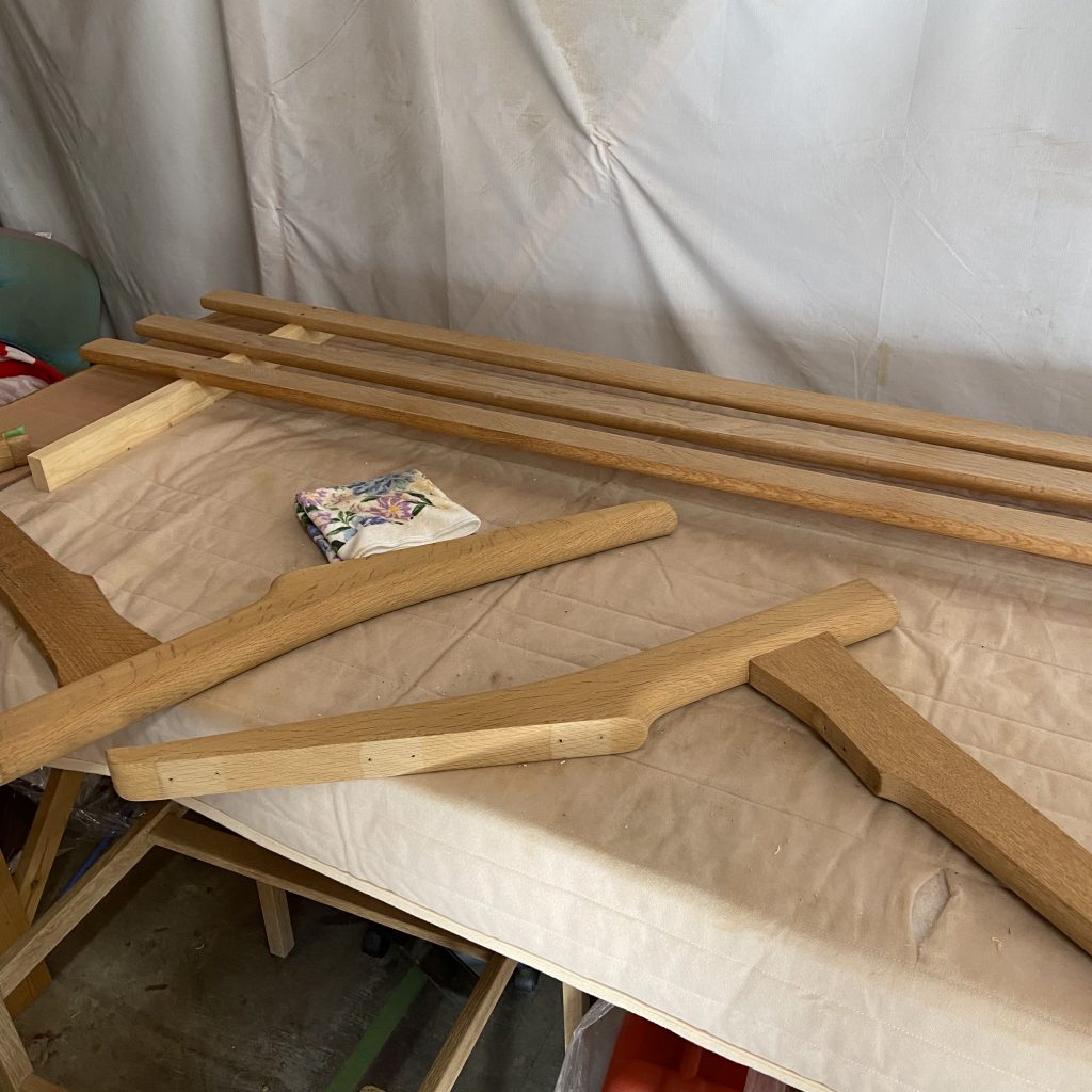 GE236木部、分解作業 ネジを外し、背もたれのフレームを外…