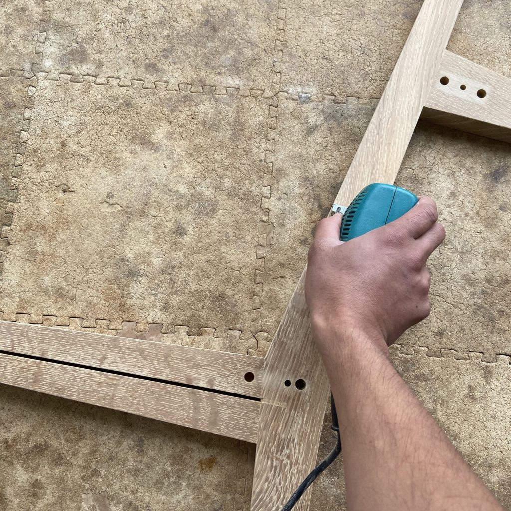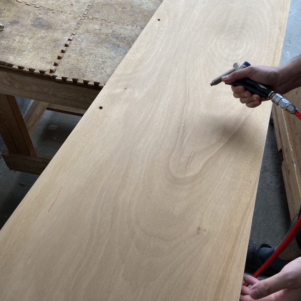 サンディング後エアーで木屑を飛ばし、水拭きをして全体をきれい…