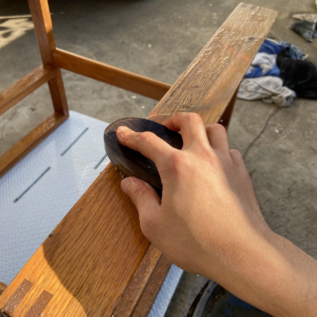 材質はマホガニー 全体に剥離剤を塗り、スクレーパーで剥がして…