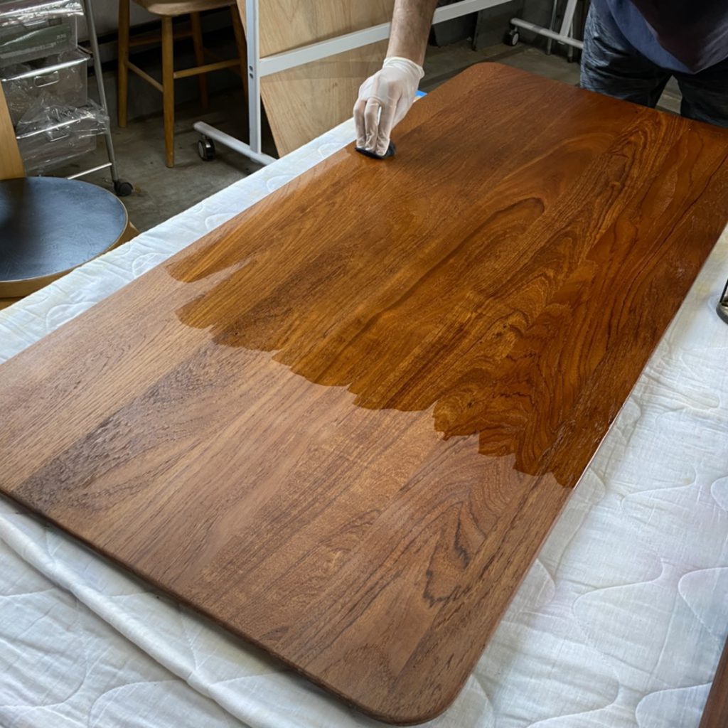 サンディングの木屑をきれいに取り除き、オイルを塗布していきま…